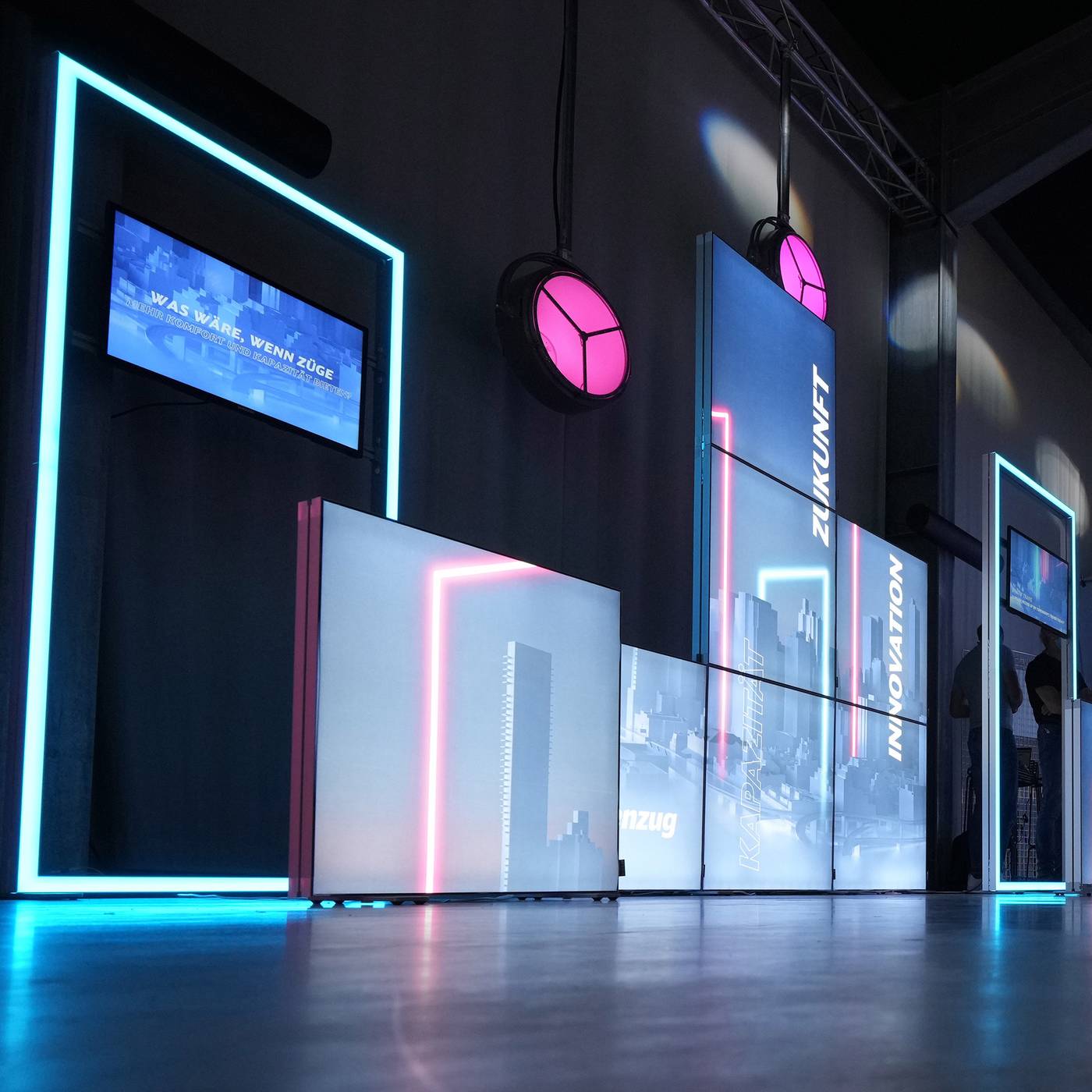 Züge und öffentliche Verkehrsmittel im Kontext zukünftiger Mobilitätskonzepte neu zu denken, ist die Zielsetzung des strategischen Projektes Ideenzug. Für den multimedialen Kick-Off Event wählten die Deutsche Bahn und ihre Partner eine inspirierende, flexible Architektur von Modulap ONE. Die Modulap Leuchtwände, Leuchtkonturen und Counter bildeten den visuellen Rahmen für das Event und die zahlreichen Inhalte, etwa Podiumsdiskussionen und multimediale Live-Auftritte. Ein Highlight war die Vorführung einer kompletten S-Bahn in High-Tech-Ausführung. Mittels der werkzeuglosen Modulap Screen-Halterungen wurden zudem zahlreiche Monitore mit digitalen Inhalten in das Setup integriert.