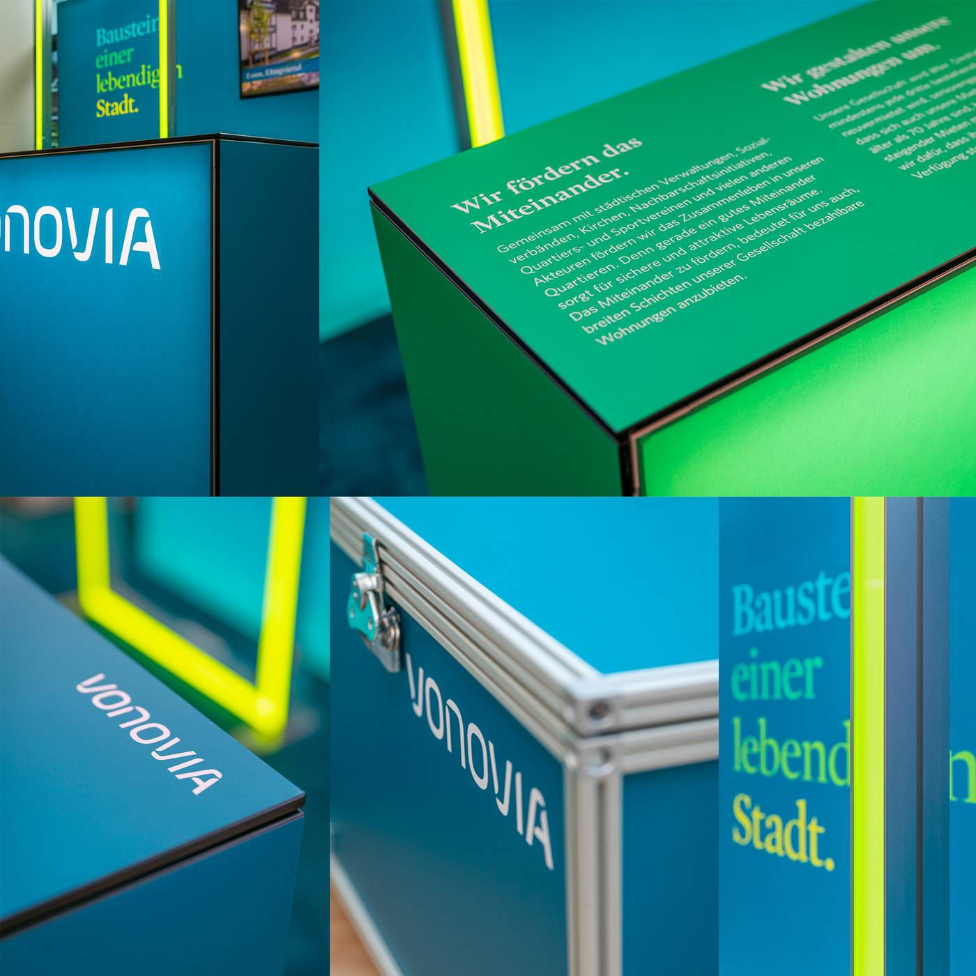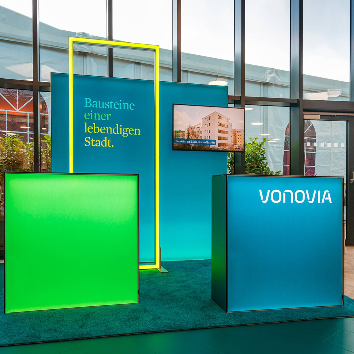 Vonovia präsentiert die Bausteine einer lebendigen Stadt: Für das Wohnbauunternehmen realisiert die Agentur M31 aus Bochum mit prägnantem, minimalistischem Design einen mobilen Messestand für unterschiedliche Veranstaltungsorte. In die rückseitige Lightbox ist ein Screen integriert, auf dem aktuelle Projektvideos laufen. Die Kernbotschaft wird durch einen vorgestellten Lightframe hervorgehoben. Zwei flexibel stellbare, leuchtende Counter dienen als Empfang und als Ort für den Kundendialog.