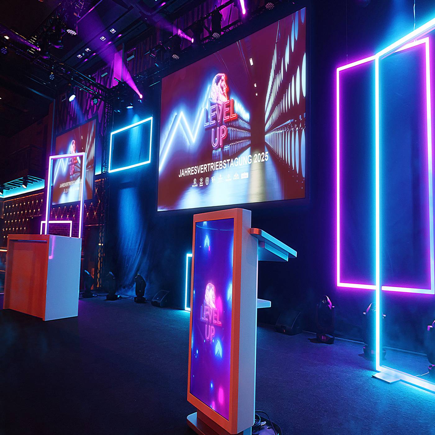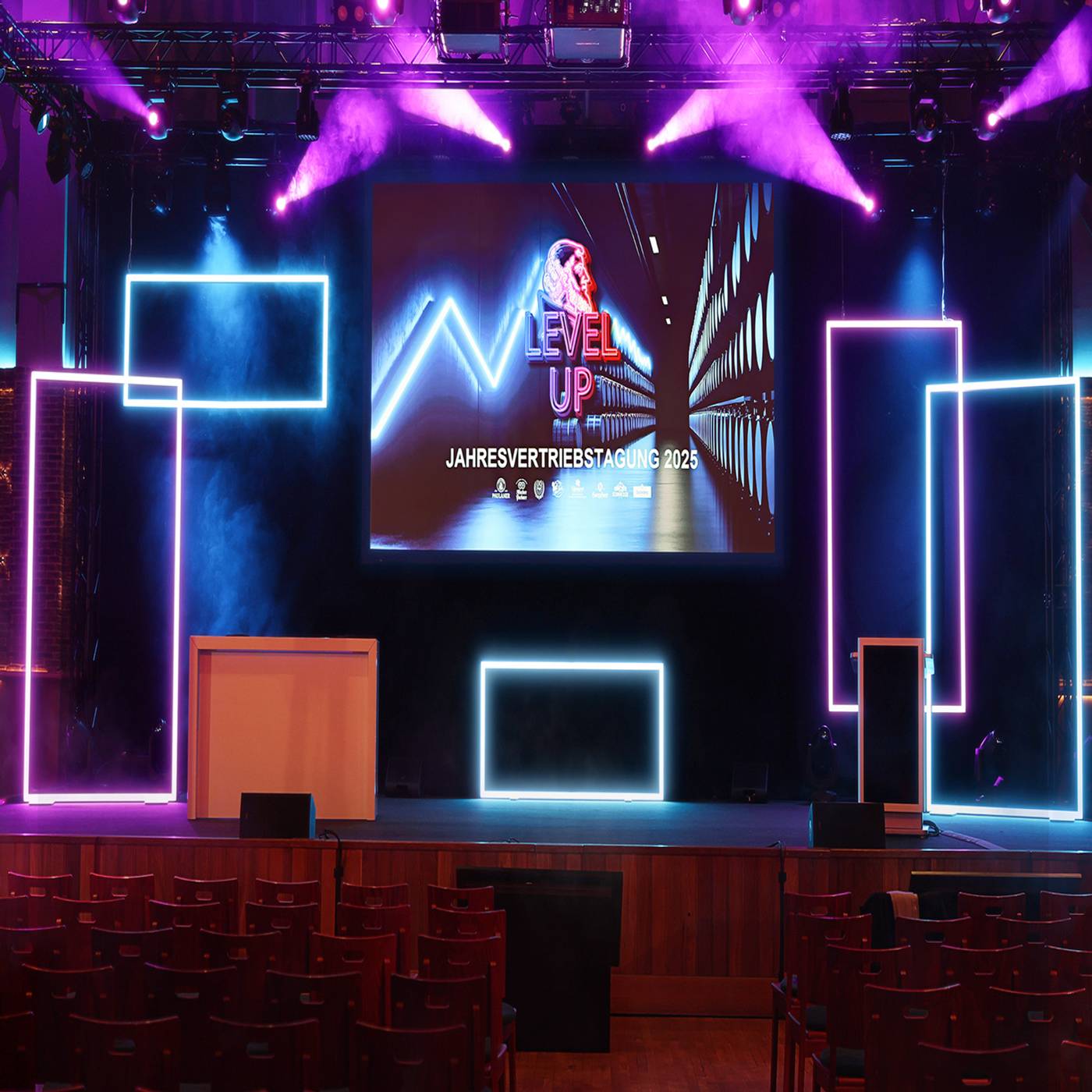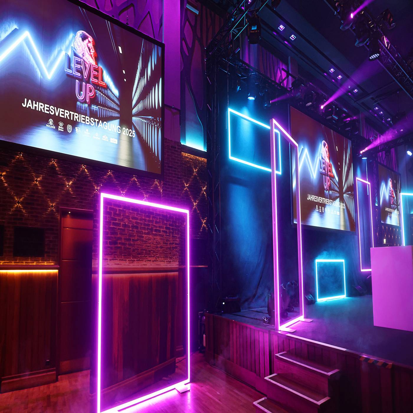 Der Titel „Level Up“ war auf der diesjährigen Jahresvertriebstagung der Paulaner Brauerei Gruppe in München Programm. Das Event, welches das gesamte Vertriebsteam zusammenbrachte, wurde von der Paulaner Brauerei Gruppe in Zusammenarbeit mit Eisele Communications organisiert. Das Tag- und Abendprogramm war gefüllt mit spannenden Insights und wurde durch einem mitreißenden Gastbeitrag sowie Performances abgerundet. Für die Inszenierung der multimedialen Bühne im Paulaner am Nockherberg mietete das Team von Eisele Communications ein Set mobiler Leuchtkonturen von Modulap. Mit den Lightframes in unterschiedlichen Formaten entstand ein offenes, modernes Bühnenbild. Die farblich steuerbaren LED-Rahmen wurden passend zum Programm abgestimmt und animiert. Eine Herausforderung für das Bühnenbild war der straffe Zeitplan: Die Anlieferung und der Aufbau mussten an einem Tag erfolgen, der Abbau am Abend nach dem Ende der Veranstaltung. Begleitet wurde das Setup von einem Teammitglied von Modulap. Dank des werkzeuglosen Systems und der intelligenten Verpackungslösungen konnten alle Lightframes zeitgerecht aufgebaut und direkt nach dem Event wieder im Kleintransporter verstaut werden. Gratulation an die Paulaner Brauerei Gruppe und Eisele Communications zum gelungenen Event, und Danke für die gute Zusammenarbeit!