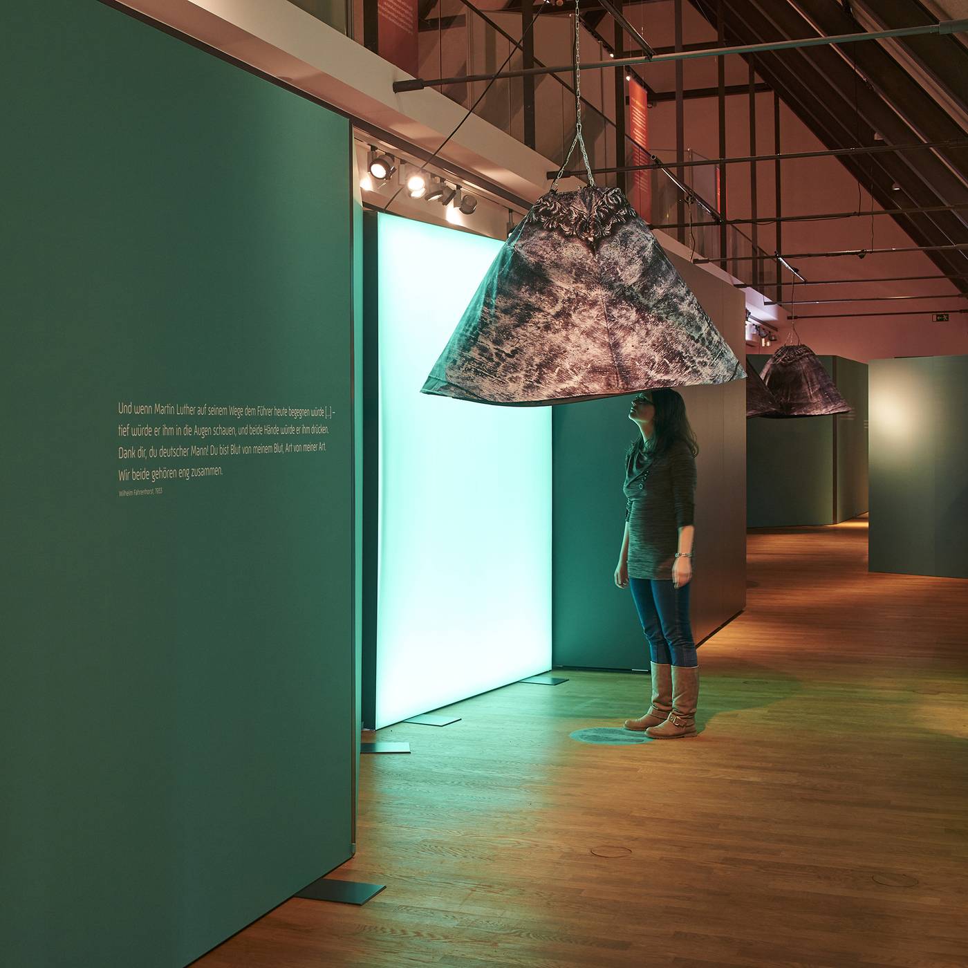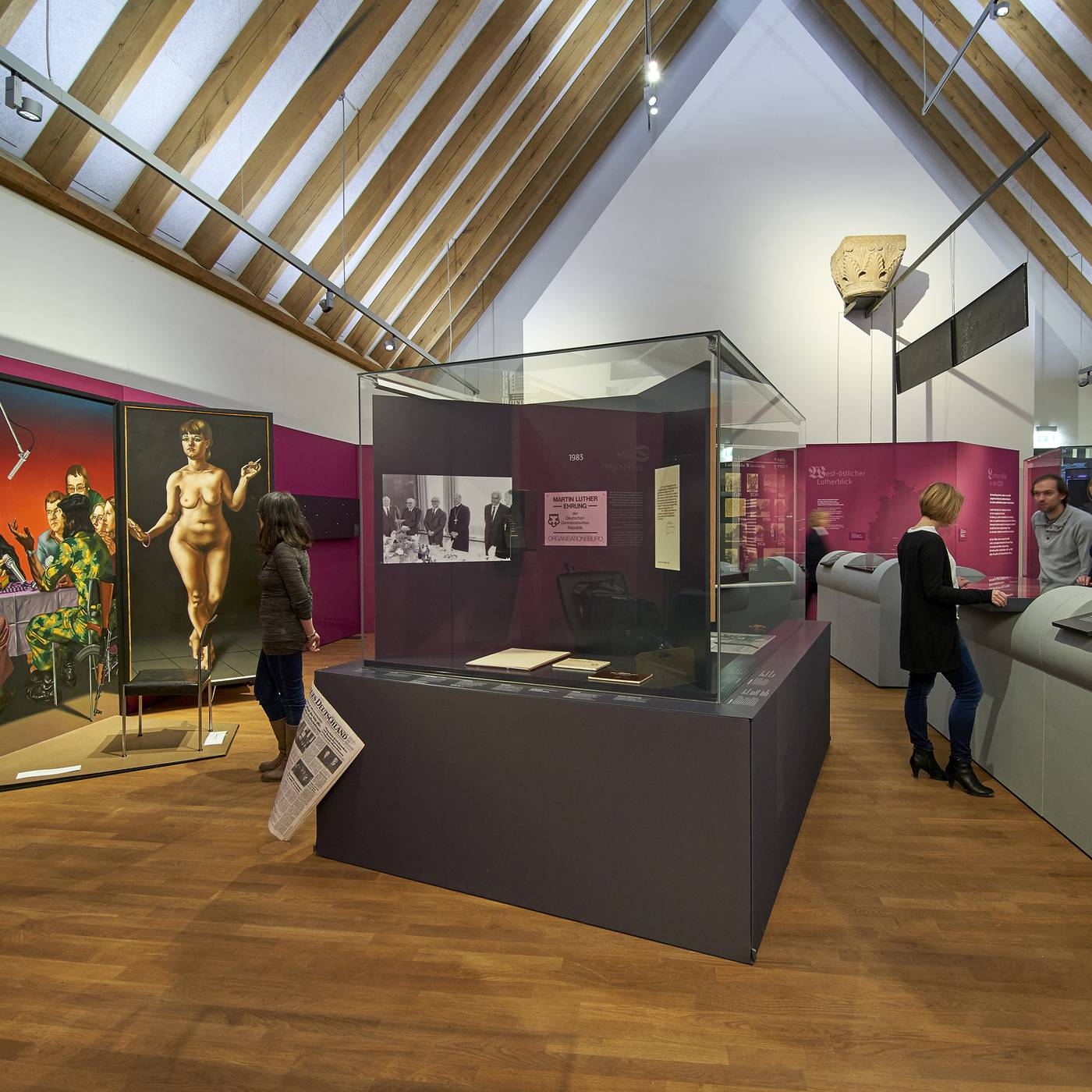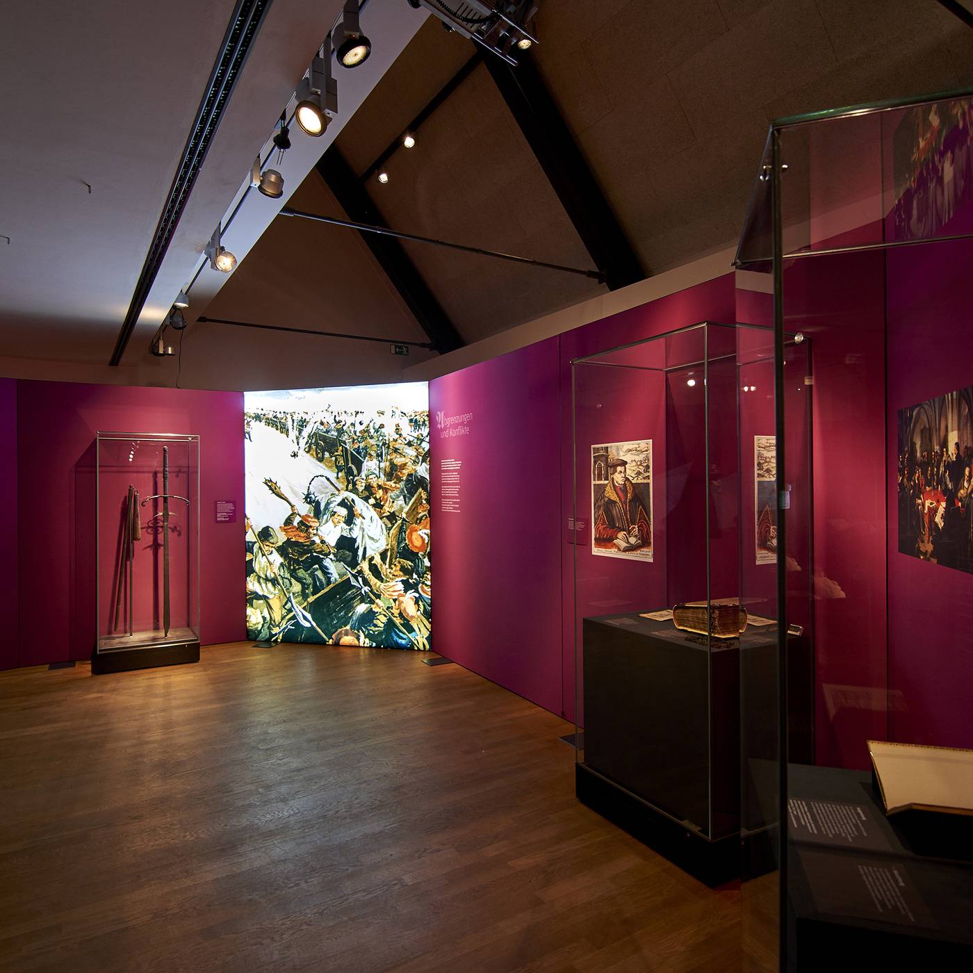 The special exhibition "LUTHER. 1917 to today" in the Landesmuseum Kloster Dalheim illuminated the figure of Martin Luther and its importance over the past 100 years using a multimedia journey through the historical rooms of the monastery. With a combination of Modulap Texframes and Lightboxes, well over 1000m² of exhibition space was realized within a defined budget. The prints were produced using the thermo-sublimation printing process on environmentally friendly Ökotex material to minimize evaporation and impact on the historical paintings. The entire exhibition architecture, including the walls and LED light walls, the orientation system, the projection surfaces and the interactive installations, was developed by Zirbes Medienagentur and K+N Kommunikationsdesign with Modulap Visual Systems. Since then, the wall structures have been used regularly, with current prints, for exhibitions in the Dalheim monastery and at other locations.