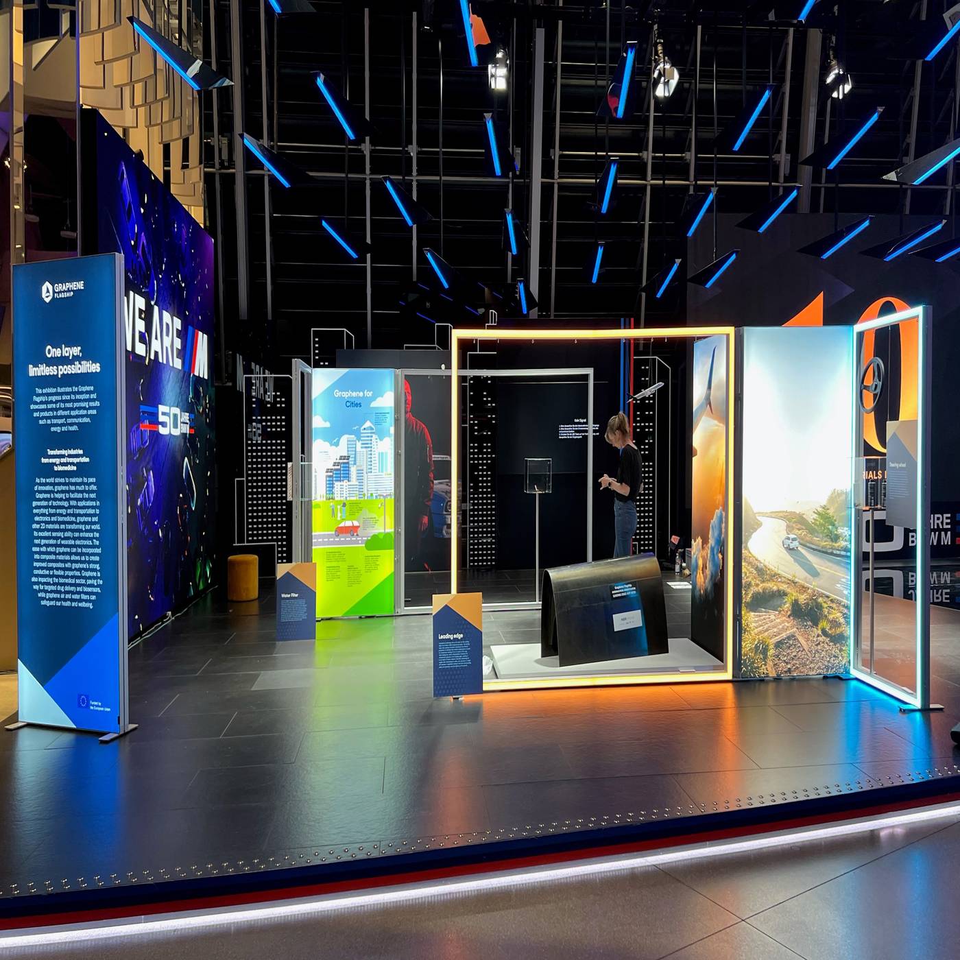 Graphene Flagship is one of the major research initiatives of the European Union as part of the Future and Emerging Technologies program. Its goal is to make graphene and its special properties industrially usable. The latest research results were presented at the Graphene Week 2022 at BMW World in Munich. The modular stand concept from Modulap enables a wide range of positioning options, both as a stand-alone brand space and as an island, row or corner stand. The light, slim design saves resources, and the small packaging size minimizes the efforts in logistics and the carbon footprint. The entire set is assembled by 2 people in just 6 hours. The next brand space location is Sweden. Many thanks to the team of the Stockholm agency BOID for the good cooperation!