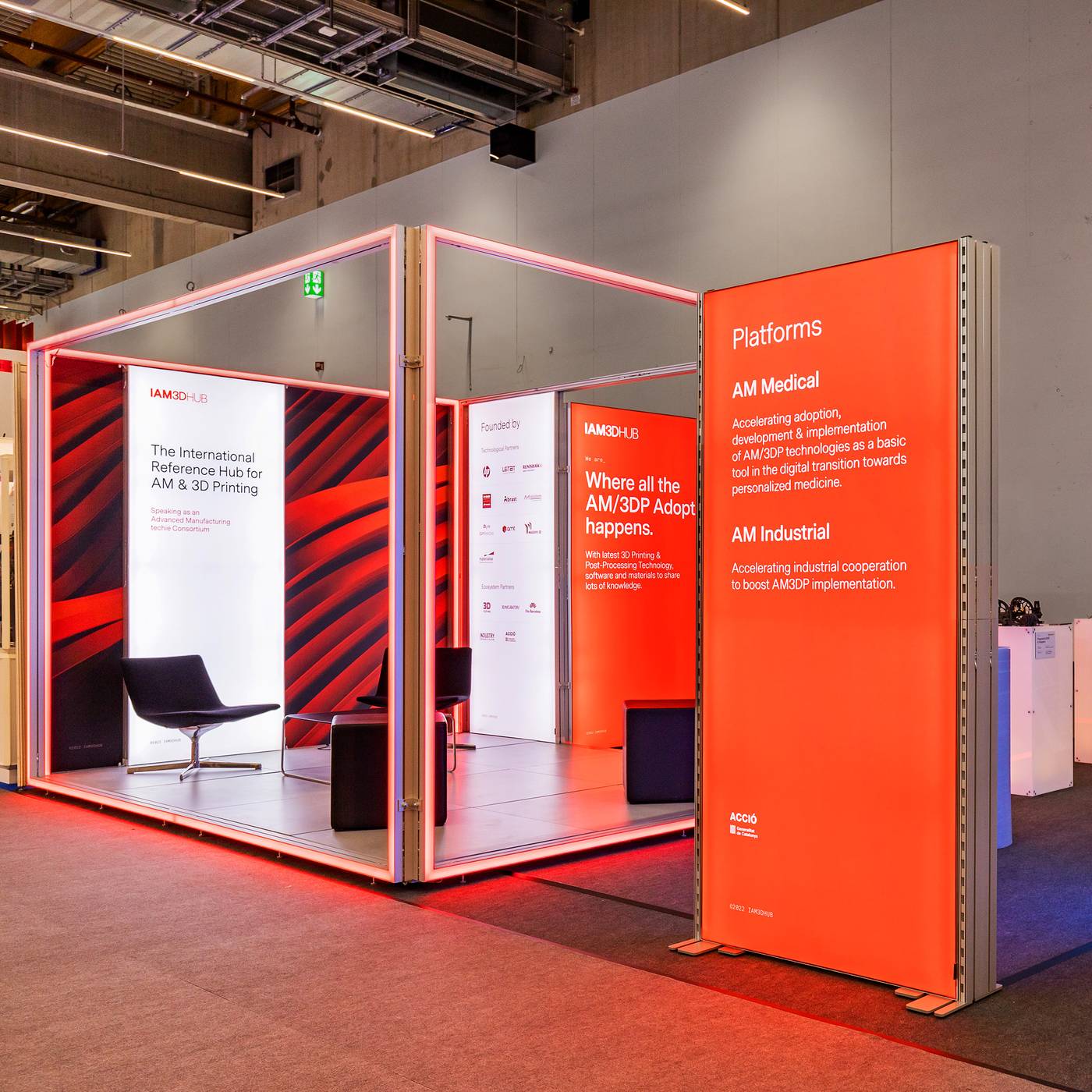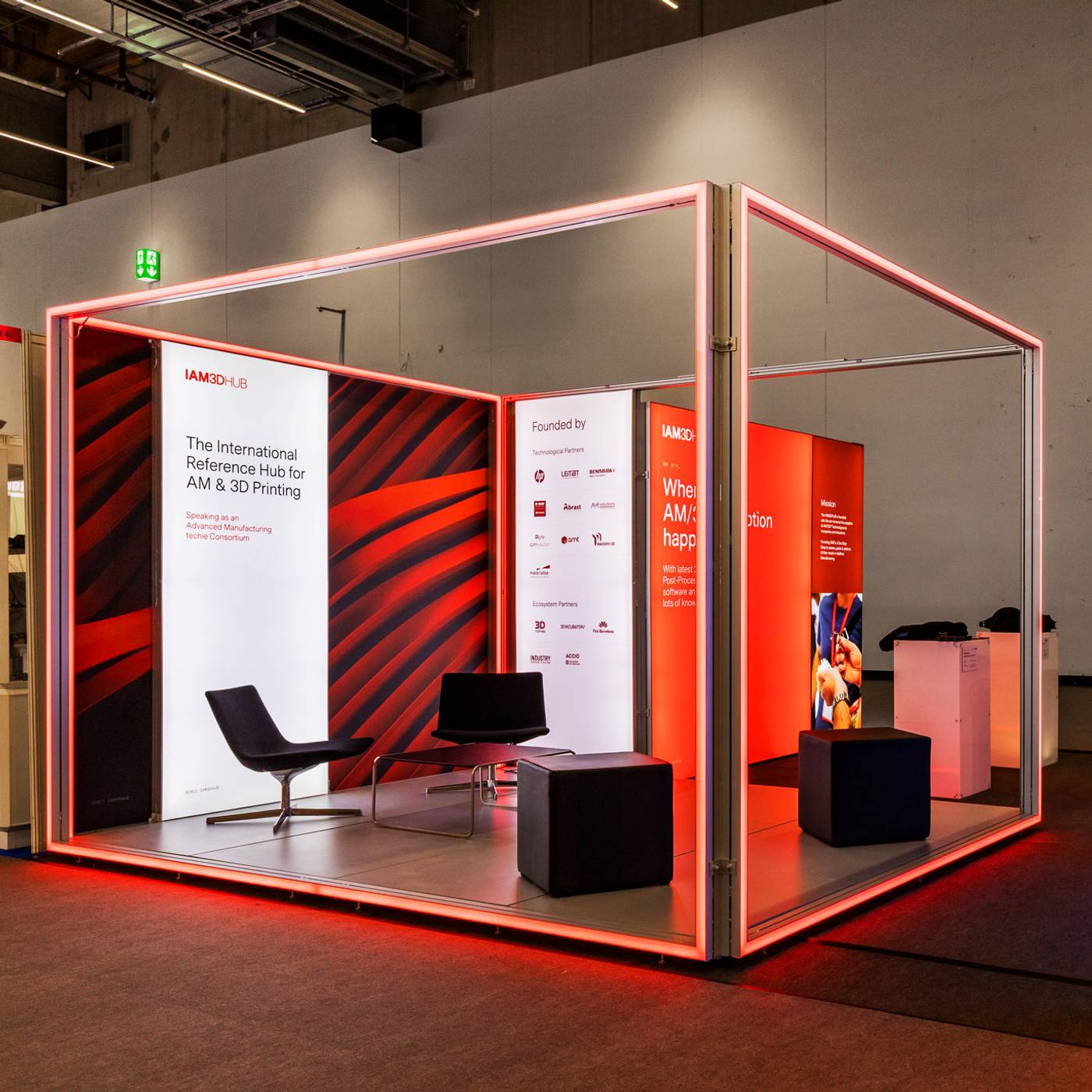 For the Spanish platform IAM3DHUB, which provides companies with technologies for 3D printing and additive manufacturing, the Modulap premium partner Kon-Org designed a mobile brand space with a concise and inviting lounge area. The booth had its premiere at FORMNEXT, the leading industry platform for additive manufacturing and industrial 3D printing in Frankfurt (Main). For the stand concept, the Cologne-based trade fair stand specialist Kon-Org combined large-format lighting contours from the Modulap BIG ONE series, modular light walls with rear-mounted cabins and free-standing Lightboxes. The rear wall of the cube is filled with blockout and has a pre-mounted light box, which can be inserted into the light frame by removing the feet. This creates an inviting and appealing ambience with a pleasant depth to it Thanks to the matching Modulap system floor, the standing area is slightly higher and fits seamlessly with the light contours. Whether as a think tank for concentrated work, an inviting lounge in the meeting space - the Modulap Cube is incredibly versatile. Despite the impressive, spacious exhibition stand with many positioning options, all modules can be packed quickly and easily to volume. Thanks to Modulap's tool-free exhibition stand system, the customer is able to safely set up at any location. The transport throughout Europe and the assembly at many other trade fairs and event locations is super easy. And as the client saves cost for assembly, transport and storage, it is also economical and sustainable.