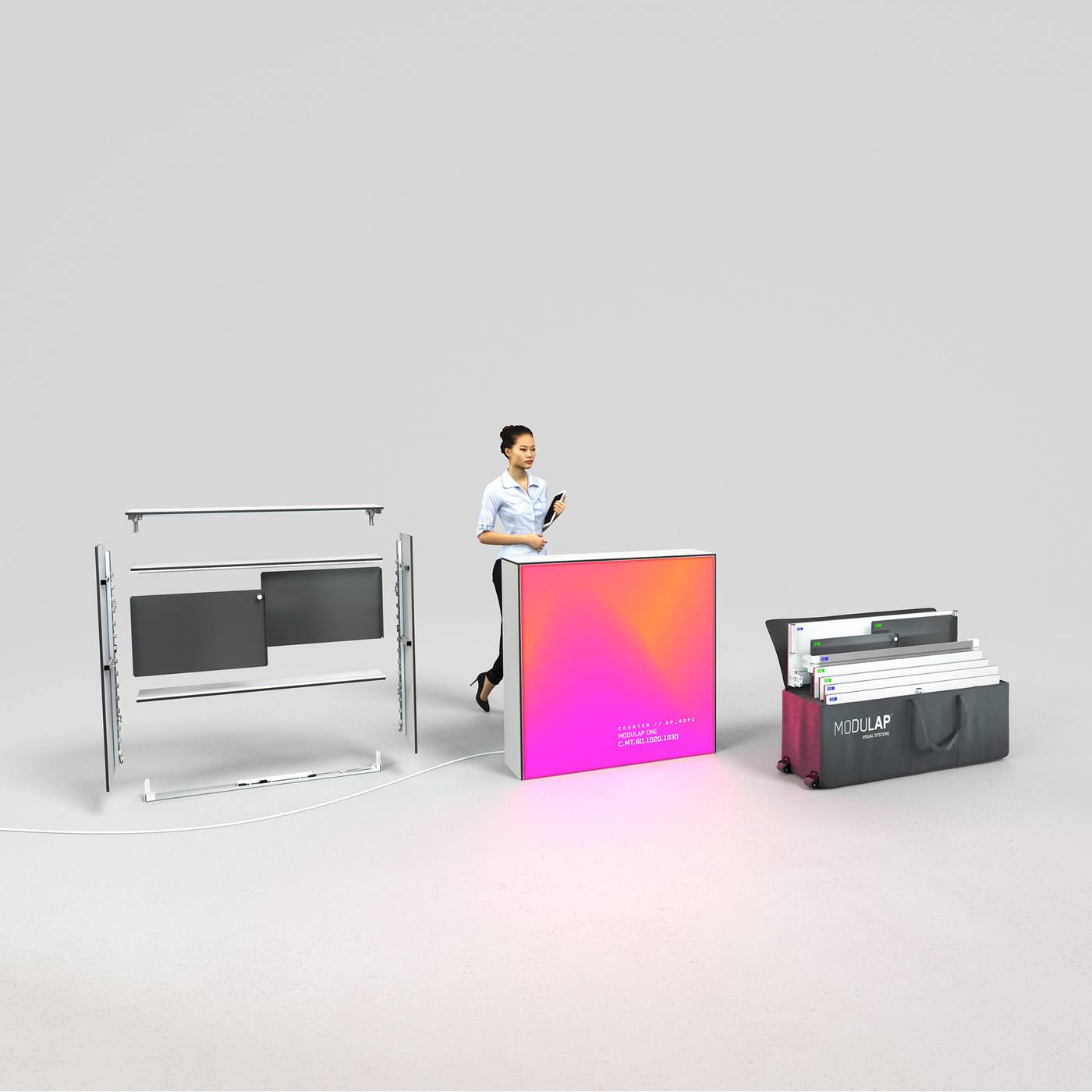 The counter should be easy to assemble – even with lockable doors – while maintaining its minimalist design and brightness. As a solution, we found slim sliding doors that offer practical storage space with two shelves on the back side. The result is our lockable counter. It looks stunningly good, is lightweight, sturdy, and impresses both as a trade fair counter and as a visual highlight. Just as you are accustomed to from your Modulap Counter. And of course, we deliver it to you in a practical trolley, with which anyone can comfortably transport the counter.