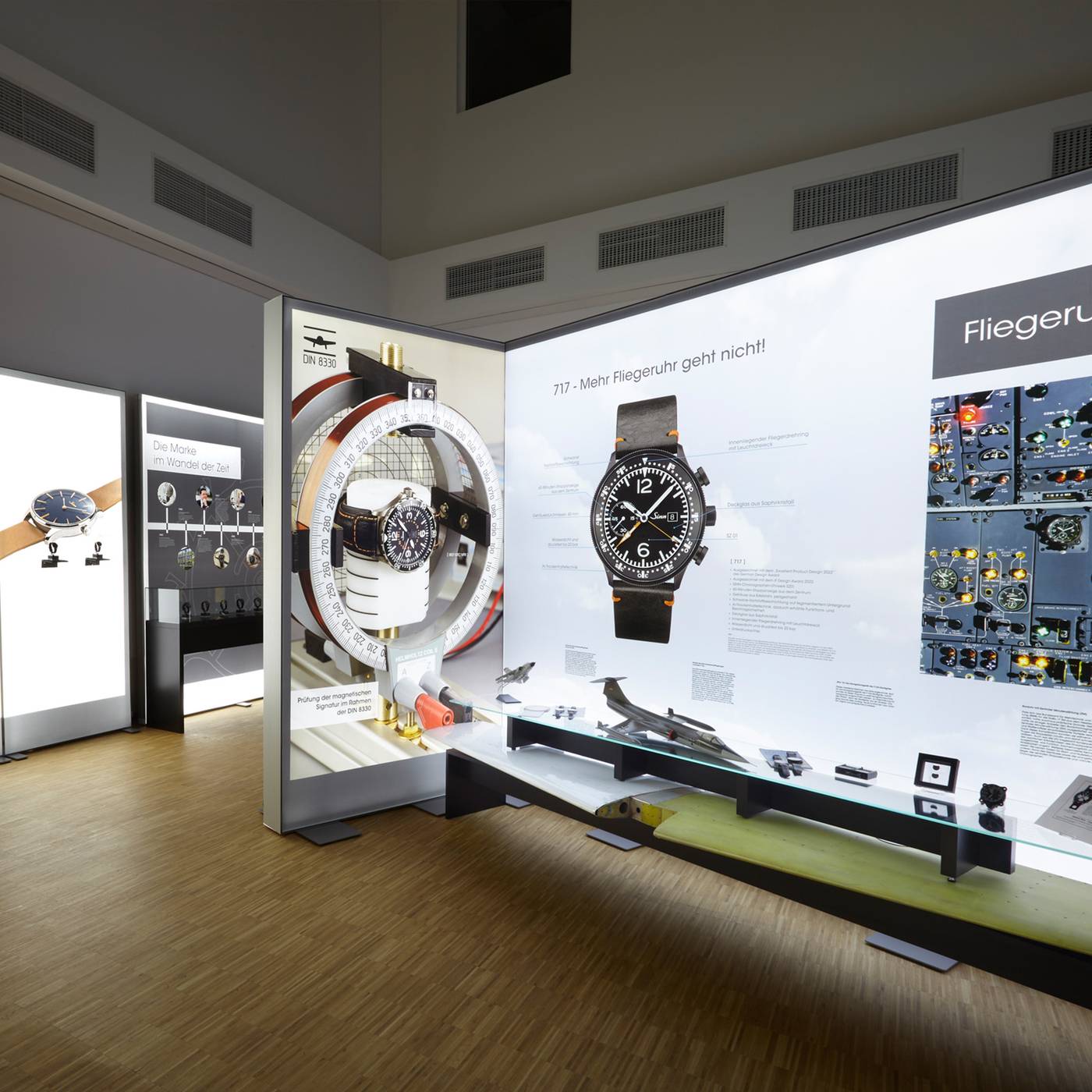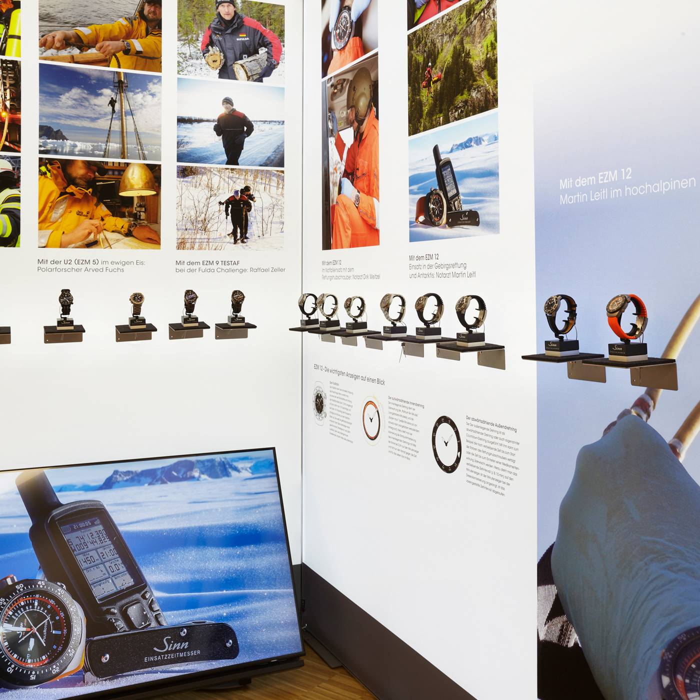 The exhibition architecture is implemented using Modulap Lightboxes from the AP_80 and AP_175 series. The large-format wall elements with uniform, brilliant illumination, high-end printing, high stability, and flexible positioning and combination options are perfectly suited for the open and timeless exhibition concept. Some elements are suspended from the ceiling as widely visible highlights. Some of the valuable exhibits are presented directly on the Lightboxes using tool-free and flexibly positionable magnetic holders. Thus, SINN creates an individual atmosphere with facets of a museum, exclusive boutique, and modern showroom using a selection of flexible Modulap ONE elements. After the exhibition, the Modulap elements can be stored and transported in a space-saving manner, and flexibly reused in new contexts.