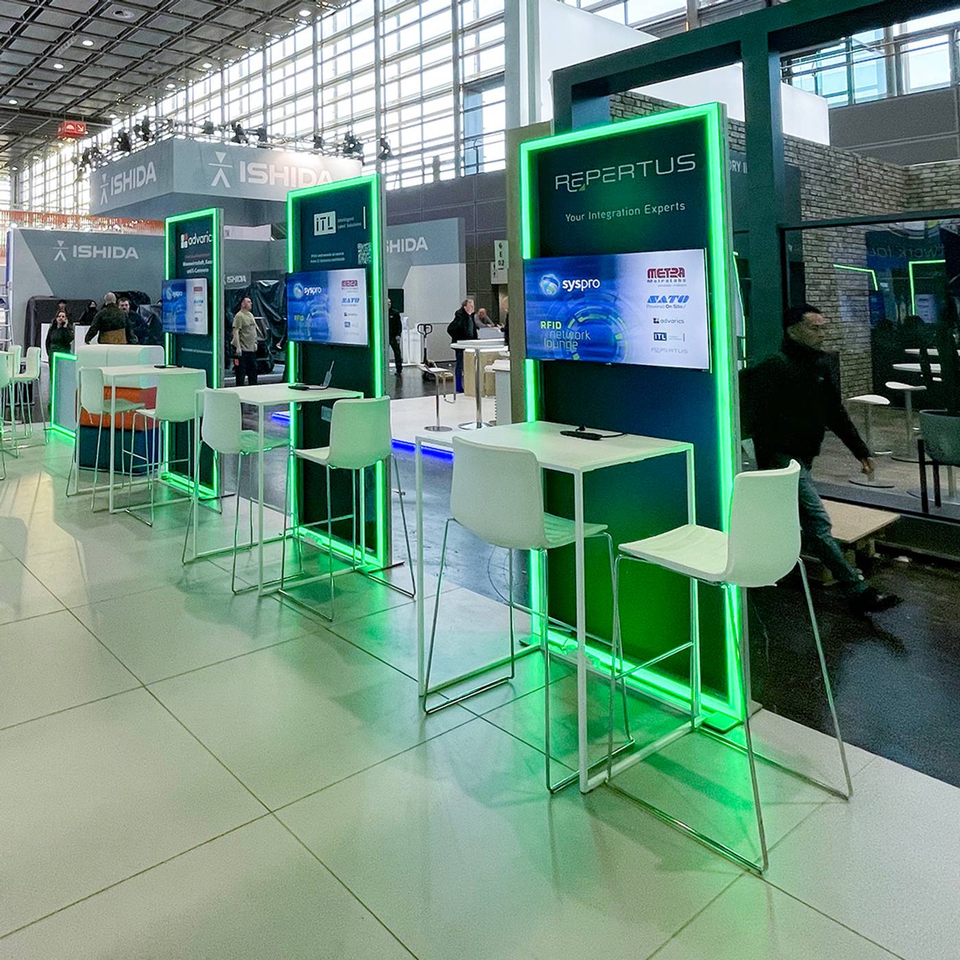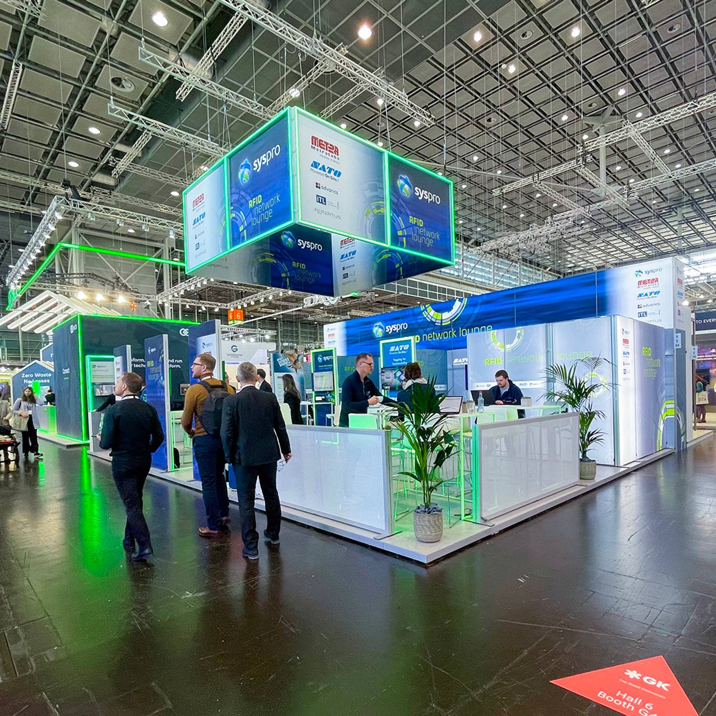 The agency sense:ability from Berlin realized the booth concept for SYSPRO with Modulap ONE. For EuroCIS 2022, the IT and RFID provider wanted an eye-catching and efficient trade show appearance. Thanks to our flexible floor modules, the stand appears to float in space. Two 2x1m booths integrated into the structure offer plenty of storage space. Modulap ONE light contours support the large-format screens and matching brochure holders. The ceiling rings, visible from afar, are realized from our standard lightboxes in D format. Without base plates, with tool-free corner connectors and the matching cable set (see accessories), illuminated ceiling rings are created. And in stand situations without the possibility of ceiling suspension, the Lightboxes easily integrate into alternative stand concepts.