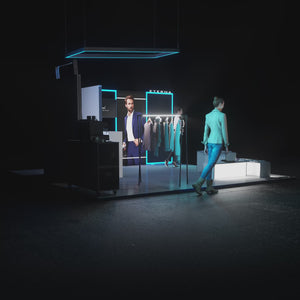 Ethan Set from the Expert Series creates a high-quality presentation area for brands, products, and collections. The combination of large-format LED lightbox walls, distinctive lightframes with mesh filling, and a suspended lightframe produces a clear architectural structure with strong visual impact from a distance.