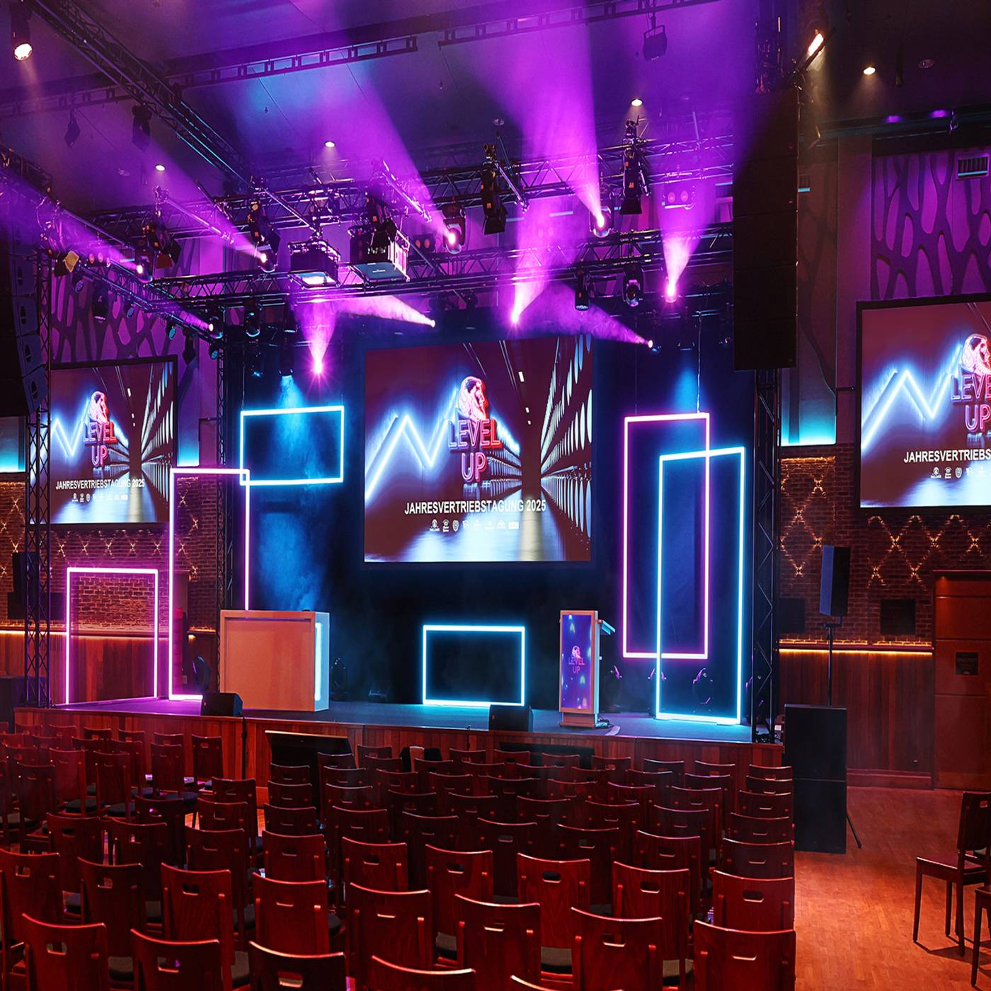 Le titre « Level Up » était le thème de la conférence annuelle des ventes du groupe Paulaner Brauerei à Munich cette année. L'événement, qui a rassemblé toute l'équipe de vente, a été organisé par le groupe Paulaner Brauerei en collaboration avec Eisele Communications. Le programme de jour et de soirée était rempli d'aperçus passionnants et a été complété par une contribution captivante d'un invité ainsi que des performances. Pour la mise en scène de la scène multimédia au Paulaner am Nockherberg, l'équipe d'Eisele Communications a loué un ensemble de contours lumineux mobiles de Modulap. Avec les cadres lumineux de différentes formes, un décor de scène ouvert et moderne a été créé. Les cadres LED, dont les couleurs pouvaient être contrôlées, ont été ajustés et animés en fonction du programme. Un défi pour le décor de scène était le calendrier serré : la livraison et l'installation devaient être effectuées en une journée, et le démontage le soir après la fin de l'événement. Le montage a été accompagné par un membre de l'équipe de Modulap. Grâce au système sans outil et aux solutions d'emballage intelligentes, tous les cadres lumineux ont pu être montés à temps et rangés directement après l'événement dans une camionnette. Félicitations au groupe Paulaner Brauerei et à Eisele Communications pour l'événement réussi, et merci pour la bonne collaboration !