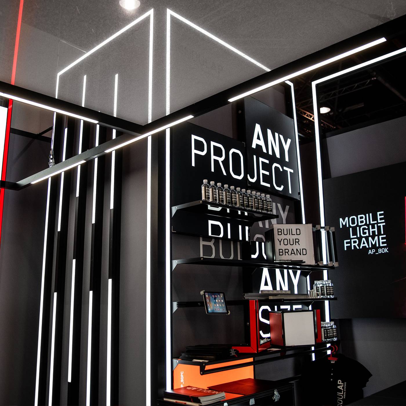 Dans la conception de stands d'exposition modernes, de plus en plus d'entreprises misent sur les contours lumineux des systèmes visuels Modulap, les leaders innovants dans la construction de stands mobiles. Ce n'est pas étonnant, car les cadres lumineux Modulap sont particulièrement polyvalents – que ce soit comme point fort visuel dans un grand ensemble de salon, comme élément fonctionnel dans un magasin éphémère, comme élément de scène ou comme partie d'un espace de marque multimédia, par exemple avec des tablettes intégrées et des écrans TV. Avec les cadres lumineux de la série X, tu obtiens des cadres LED extra-larges, avec lesquels tu peux également construire des structures de stand de grande taille et des cubes lumineux 3D surdimensionnés d'une hauteur allant jusqu'à six mètres. Tu peux utiliser le sol du salon sans interruption. Ainsi, crée à partir de quelques éléments des ensembles impressionnants et individuels, avec lesquels tu peux présenter des produits de presque toutes tailles et convaincre dans toutes les situations en direct. Combine les cadres lumineux Modulap avec d'autres produits Modulap tels que nos Lightboxes, Texframes et Cubes. Comme tous nos produits, tu peux également monter nos cadres lumineux facilement et les transporter en toute sécurité avec notre système de transport.